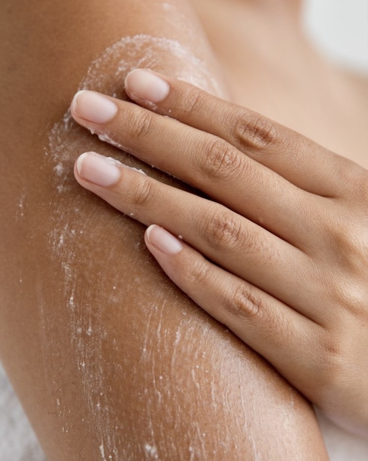 После чего полностью смойте остатки скраба тёплой водой, просушите кожу полотенцем и нанесите увлажняющий лосьон или крем-баттер из линейки «Спокойно».